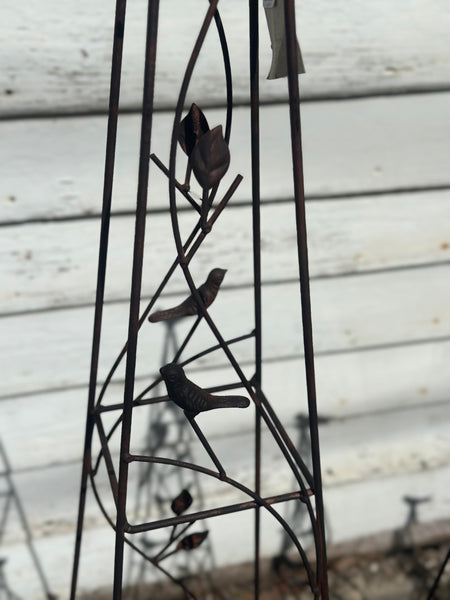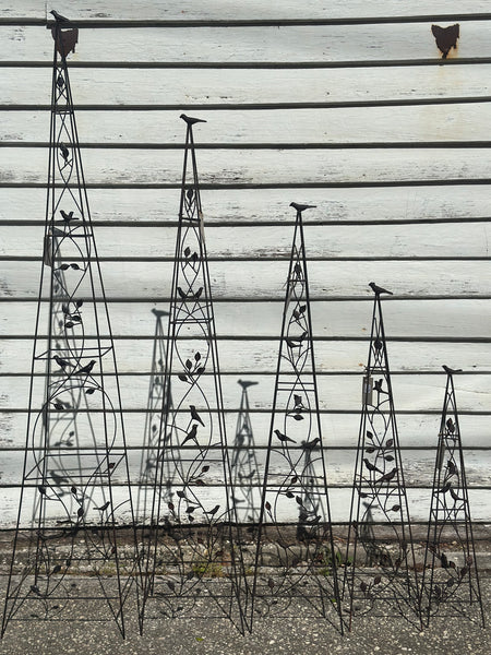 This pyramid-shaped obelisk features a square base and two intricately decorated panels adorned with bird and leaf motifs. Available in five sizes, it offers a graceful and sturdy support for climbing plants while adding an artistic touch to your garden. Its elegant design blends natural themes with functional structure, making it a refined choice for enhancing your outdoor space.