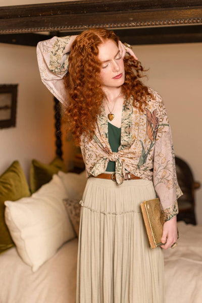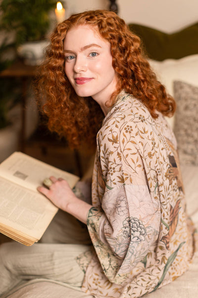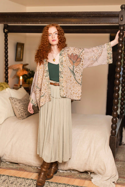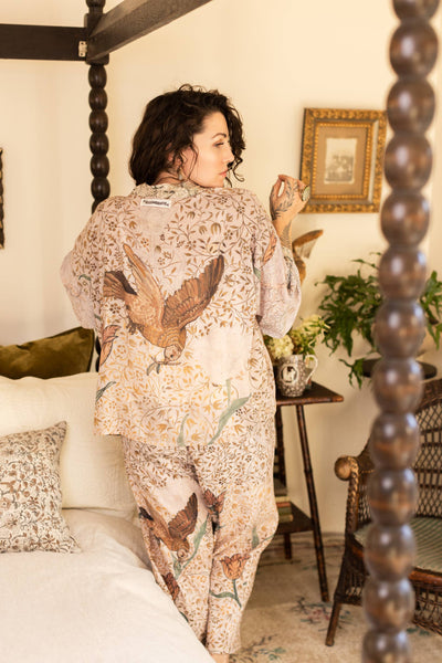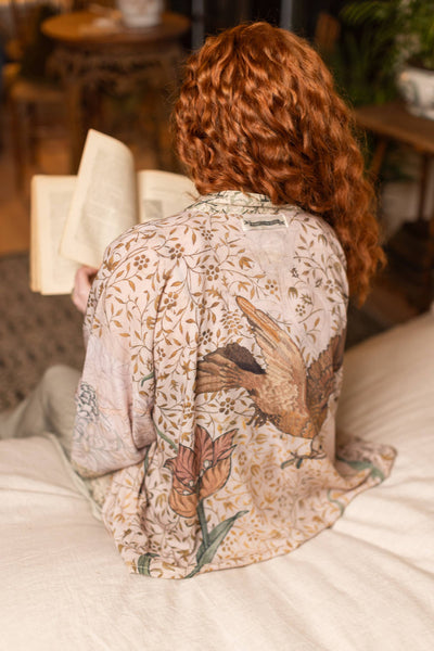 A fairy tale you can wear -- Folklore is our celebration of the Arts & Crafts movement, and our nod to the beauty of “non-finito” (art that is a work-in-progress). The printed Bird of Peace comes from an original hand stitched work by fibre artist Kim Donohoe, who used single-ply thread to capture every detail of plumage. The background panels come from unfinished works created in 1885 by British artist William Morris, whose original pencil sketch lines can be seen where the designs remain incomplete. We left these in intentionally, to celebrate the profound beauty of the artistic process!