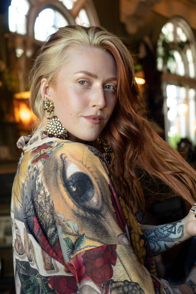It takes a bold heart to live your truth. To keep reminding yourself that love is the answer, even on your hard days! We created this eclectic, super cool kimono from an 1880s archival print, and adapted the utterly charming wood-grain lettering to build the trim. The result is one of our favourite pieces in the collection: beautiful and completely unique, with a lot of romance, and a touch of rock and roll.