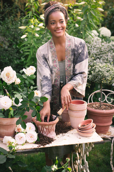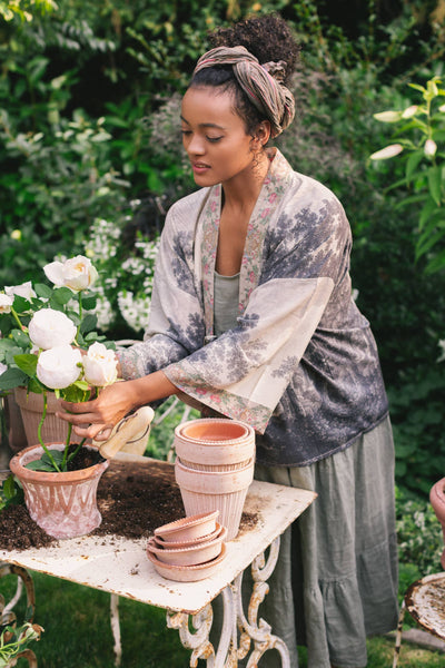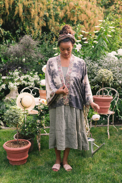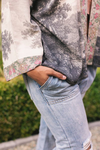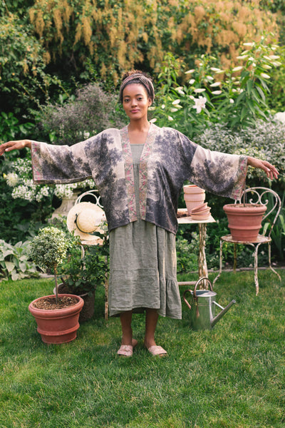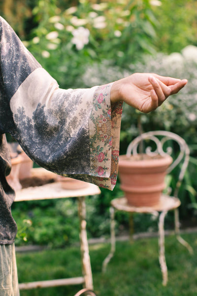 Dreamy, romantic, and full of hope — Still I Rise was created for those who meet each day with a loving and tenacious heart, come what may. We layered together several historic engravings from the 18th century to make this piece— including English forest landscapes by artist William Woolett— and married them with the captivating image of a woman boldly greeting the sun. There’s something so strong in her posture, and we love that she’s stepping forward to meet the day in her bare feet with joy! The trim comes from an intricate watercolour-and-ink drawing of an American heritage quilt from the 1930’s, which pairs beautifully with the black and beige backdrop. Machine wash gentle or handwash and hang to dry. 100% viscose (derived from plant fibres such as wood and bamboo). Measurements: length 60cm, width 74 cm across. Model is 5’2” for reference. * bohemian gypsy chic artsy resort lounge holiday antique