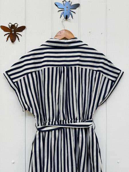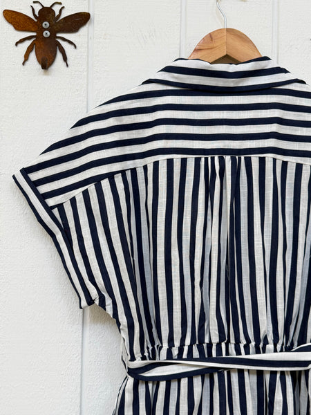 A timeless striped dress that captures classic elegance with contemporary ease. The crisp black and white stripes create visual interest, while the defined collar and integrated belt cinch the waist for a flattering silhouette. The elongated length offers refined sophistication, making this piece equally suited to professional settings or refined casual occasions. Versatile styling potential in a wardrobe essential.
